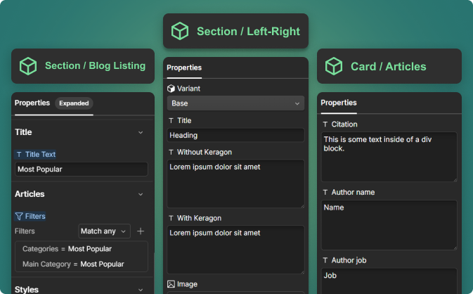 Like Lego bricks for your website. Each element (button, card, section) is created once and reused everywhere. One global change with a single click.